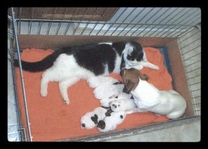 Here is one of our Jacks with a cat – right inside the kennel with the new pups! Our dogs will tolerate trying children, get along with most any animal and downright enjoy being social with everyone!